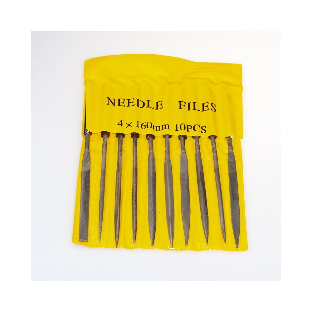 Набор надфилей, состоящий из 10 штук. Размеры надфилей: диаметр 4 мм, длина 160 мм. Применяется для обработки закаленной стали, керамики и других материалов. При работе их необходимо смачивать водой. Подходят для того, чтобы придать необходимую форму краям поверхности изделия. В комплект входят квадратные (квадрат), круглый, полукруглый, трехгранный (треугольных) надфиль.
