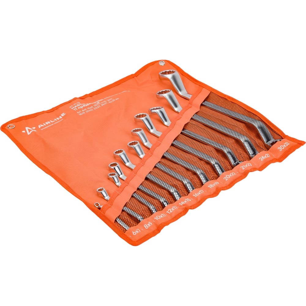 Набор накидных ключей 6-32мм 11 предметов в мягкой сумке Airline AT-11-13 состоит из инструментом с отогнутыми головками. Это существенно упрощает процесс вращения крепежа вблизи поверхности или в слегка утопленных пазах. Финишное хромовое покрытие обеспечивает надежную защиту от коррозии и упрощает очистку поверхности от различных загрязнений. Преимущество конструкции - смещенное пятно контакта для уменьшения нагрузки на основание головки.
