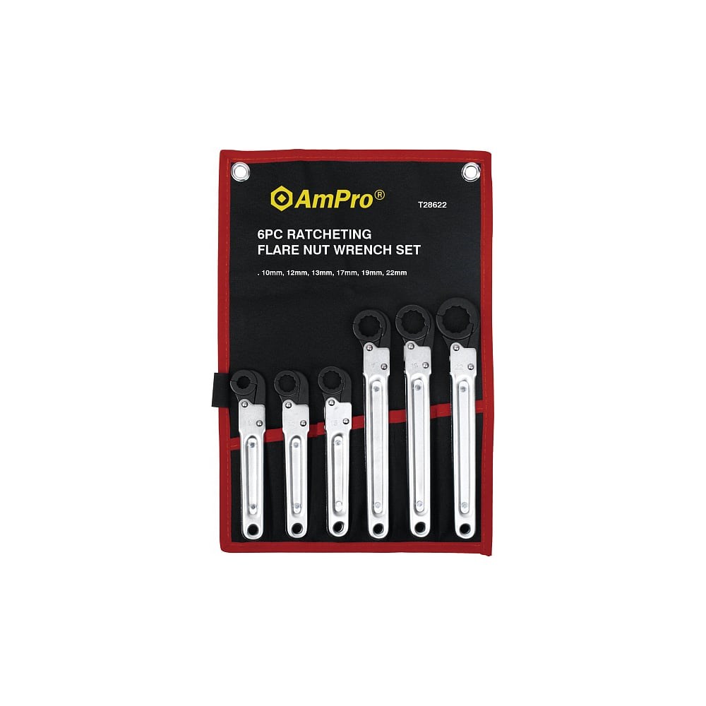 Набор ключей AmPro накидных раскрывающихся с трещоткой, 6 предметов, 10-22мм T28622 подходит для крепежа различного вида. Инструмент имеет высокую прочность, которая обеспечивает работу с большим усилием. Комплект легко справляется с классическими креплениями без вспомогательного оборудования. Это значительно упрощает работу монтажника на производстве или мастера в сервисе.