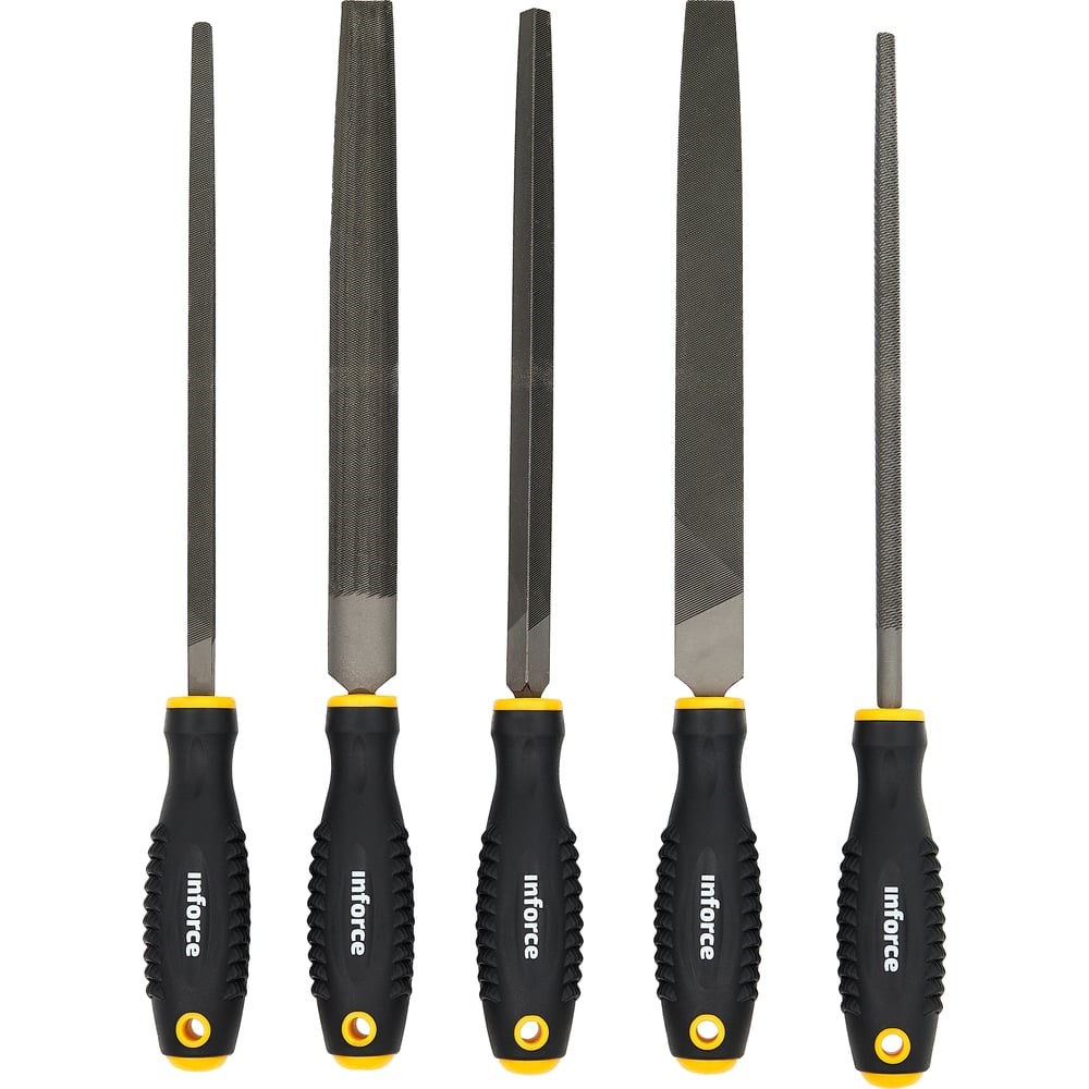 Набор напильников Inforce 200мм, 5 штук 06-15-06 подойдет для выполнения черновых работ с металлом. Благодаря различной форме лезвия допускается работа с плоскостью, углами, округлыми выпуклыми и вогнутыми поверхностями. Инструмент оснащается полиуретановой рукояткой, удобной для удержания и устойчивой к маслу и бензину.