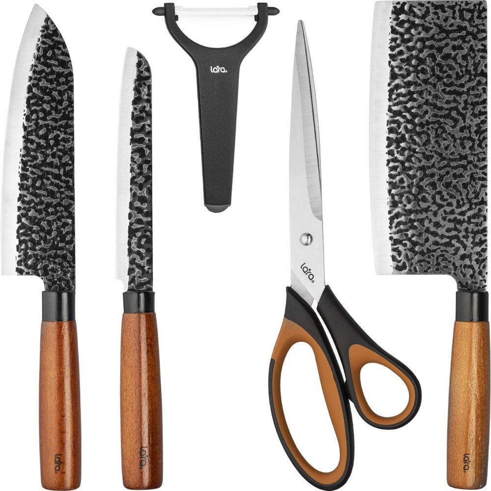 Набор ножей Lara 5 предметов, топорик, нож сантоку, нож универсальный, овощечистка, ножницы, 3CR14 LR05-11 предназначен для домашнего использования. Не содержит токсичных материалов, поэтому безопасен для здоровья и окружающей среды. Благодаря высокой прочности прослужит долго. Набор легко моется, что экономит время и силы.