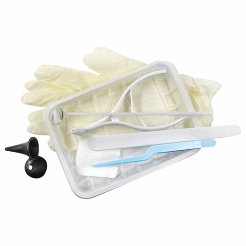 Состав набора: зеркало носовое, зеркало гортанное, шпатель для языка, воронки ушные №1, №3, пинцет, перчатки, салфетка, лоток полимерный.