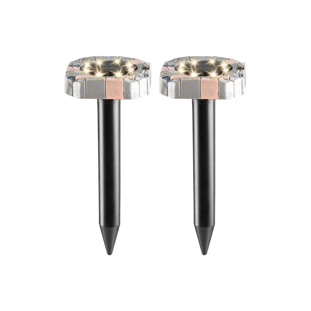 Набор ультразвуковых отпугивателей кротов с садовым фонариком REXANT R20 предназначен для борьбы с земляными вредителями, такими как кроты, землеройки, полевые мыши, медведки, змеи. Земляные вредители обладают низким зрением или вовсе слепы, но имеют хороший слух и крайне чувствительны к определенным типам вибрации почвы. Отпугиватель способен создавать вибрацию, которая предупреждает земляных животных об опасности и способствует их скорейшему исчезновению. Модель выполнена в уникальном дизайне и оборудована LED-подсветкой. В темное время суток устройство автоматически начнет подсвечивать газон или цветник. Это не только эстетически красиво, но и отпугнет ведущих ночной образ жизни и чувствительных к свету животных. Устройство безопасно для людей и домашних животных, не содержит химикатов.