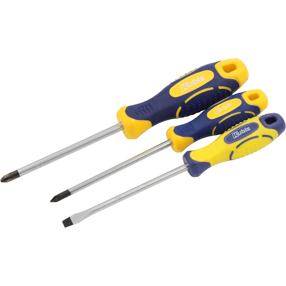Набор отверток Kubis применяется для слесарно-монтажных работ. Анатомическая двухкомпонентная рукоятка с выемками под пальцы для удобства работы Специальная форма рукоятки с защитой от скатывания с наклонных поверхностей Стержень изготовлен из закаленной хром-ванадиевой стали Намагниченный вороненый наконечник