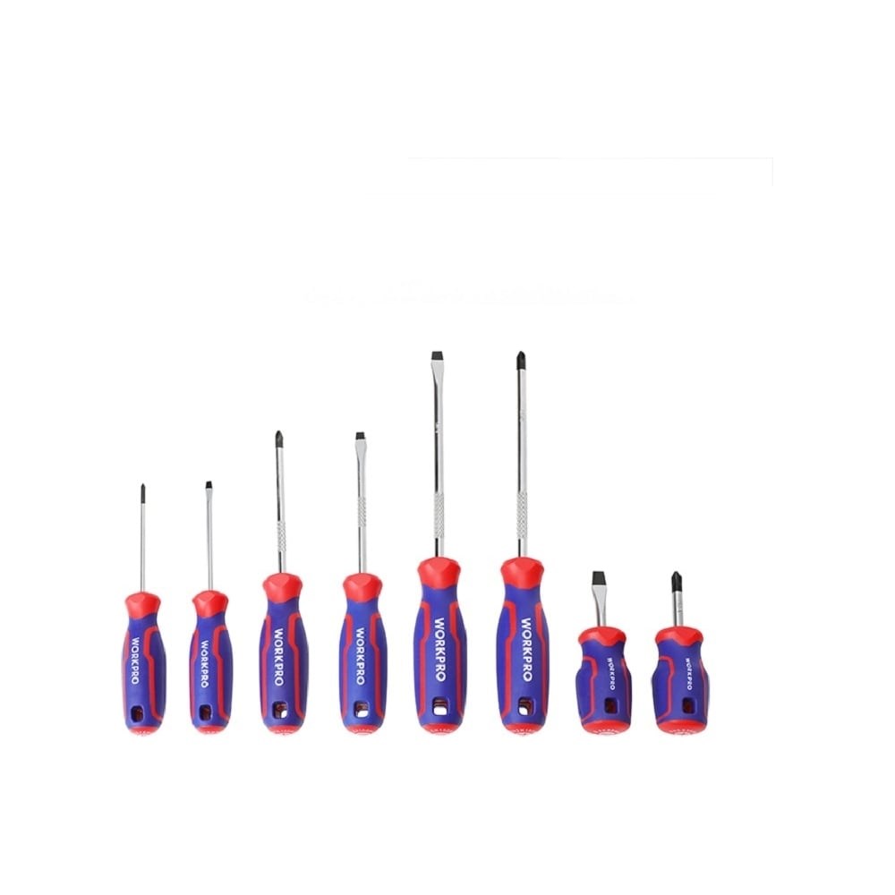 Набор отверток 8 шт WP200505 WorkproНабор отверток подходит для профессионального и бытового использования.• Кованая сталь (Cr-V) • Черный магнитный наконечник • Эргономичная удобная ручка для захвата • Накатка для быстрого вращения отвертки • Отверстие для подвеса 8шт - PH2Х38 / PH0Х75 / PH1Х100 / PH2Х150 / 6.5Х38 / 3Х75 / 5.5Х100 / 6.5Х150