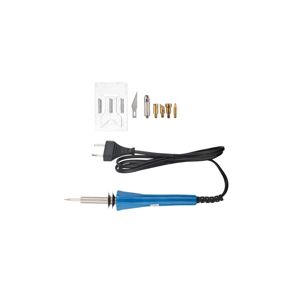Паяльник-выжигатель с набором насадок REXANT представляет отличное решение для тех, кто стремится по максимуму использовать полезные приборы. Благодаря 6 различным насадкам устройство можно использовать в качестве паяльника, горячего ножа и выжигателя.С помощью этих сменных насадок можно создавать красивые картины, выжигая на дереве различные узоры, выполнять выжигание на изделиях из кожи, резать пластмассу, вырезать на воске или пенопласте и т.п. Все насадки закрепляются с помощью резьбового соединения.В комплект входит: паяльник, жало для пайки, выжигательные насадки 4 шт., насадка-нож с цанговым зажимом, металлическая подставка.