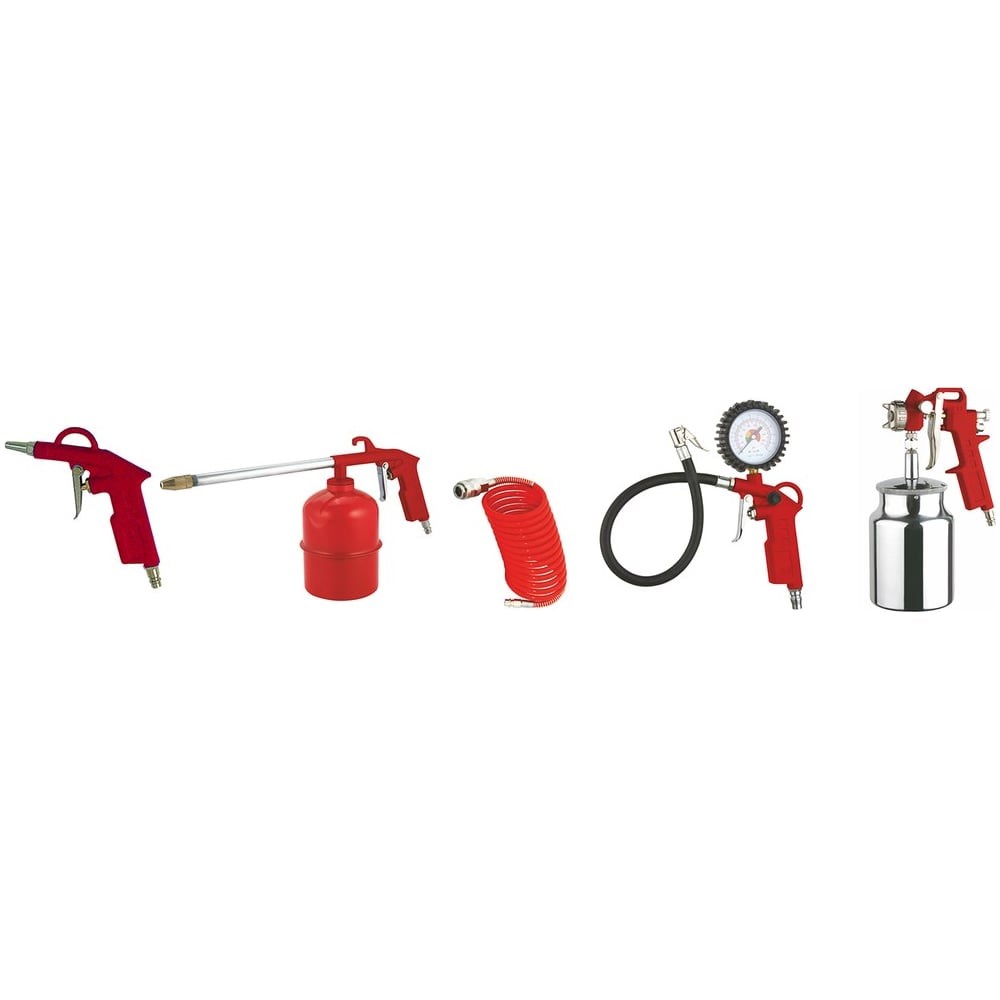 Инструменты ELITECH серии "Стандарт" неприхотливы и надёжны, рассчитаны на продолжительные, интенсивные нагрузки. Обладают необходимыми степенями защиты от влаги, пыли и нестабильного напряжения в сети.Набор пневмоинструмента Elitech 0704.012100 включает в себя 5 предметов:краскопульт с нижним бачком (расход воздуха 85-226 л/мин, давление 3,5 бар, сопло 1,5 мм, объем бачка 0,75 л)пистолет продувочный (расход 100-200 л/мин, давление 2-6 бар, сопло 2 мм)пистолет мовильный (расход 130 л/мин, давление 3,5 бар, сопло 3 мм, бачок 0,9 л)пистолет для накачки шин (расход 140 л/мин)шланг спиральный (длина 5 м, диаметр внешний 8 мм, внутренний 5 мм) Пневмоинструмент широко используется в гаражах, домашних мастерских, автосервисах. Отличается практичностью и надежностью в эксплуатации, так как:инструменты устойчивы к перегрузкам и перегреву;корпусы изготовлены из качественных и долговечных материалов;краскопульт имеет возможность регулировки факела и расхода жидкости;пистолет для накачки шин оборудован манометром, что позволяет визуально контролировать текущее давление.