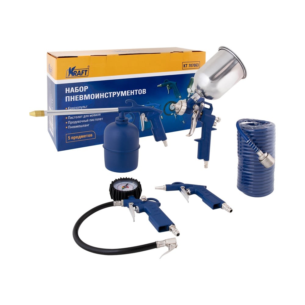 Набор пневмоинструментов KRAFT 5 предметов KT 707063 представляет собой комплект аксессуаров для компрессора, которые применяются в гаражах, автомастерских и в бытовых целях. Набор включает в себя краскопульт (КТ 707052), пистолет для накачки шин (КТ 707054), пистолет для мовиля (КТ 707055), продувочный пистолет (КТ 707056) и пневмошланг (КТ 707057).