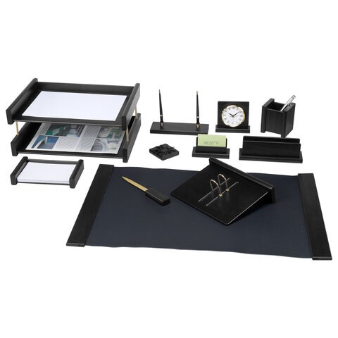 Набор состоит из 11 предметов: двойной лоток для бумаг, коврик для письма (размер - 66х43 см), подставка для ручек (2 шариковые ручки в комплекте), стакан-подставка для письменных принадлежностей, подставка для бумажного блока, подставка для визиток, нож для вскрытия конвертов, подставка для писем, скрепочница магнитная, подставка для перекидного календаря, часы. Все предметы изготовлены из дерева черного цвета с золотистой фурнитурой. Набор упакован в фирменную подарочную коробку.