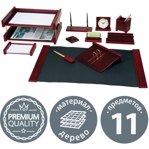 Набор состоит из 11 предметов: двойной лоток для бумаг, коврик для письма (размер - 66х43 см), подставка для ручек (2 шариковые ручки в комплекте), стакан-подставка для письменных принадлежностей, подставка для бумажного блока, подставка для визиток, нож для вскрытия конвертов, подставка для писем, скрепочница магнитная, подставка для перекидного календаря, часы. Все предметы изготовлены из дерева красного цвета с золотистой фурнитурой. Набор упакован в фирменную подарочную коробку.