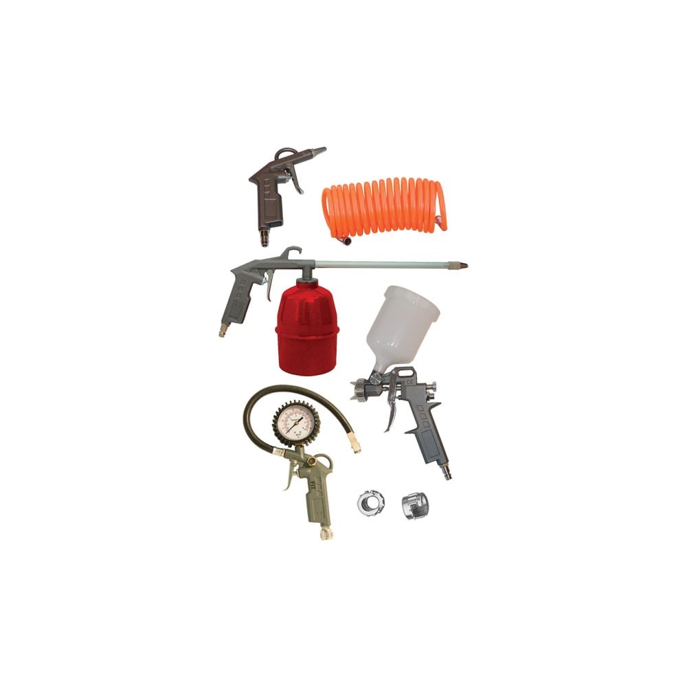Набор покрасочный с верхним бачком FIT 81060 предназначен для работ в гаражах, мастерских, дома. Краскопульт совместим с водоэмульсионными красками, синтетическими эмалями, полиуретано-выми эмалями, эпоксидными эмалями, нитроэ-малями. Моющий пистолет имеет нижнее расположение бачка для лучшего обзора. Пистолет для накачивания шин оснащен манометром - для визуального контроля за давлением. Длинный гибкий шланг обеспечивает удобное подключение.