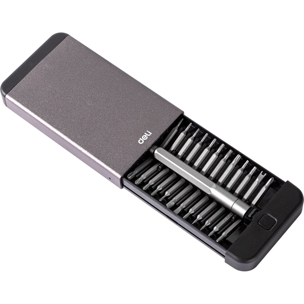 Набор прецизионных отверток DELI DL3525 25 предметов 98387 подходит для ремонта и обслуживания игрушек, часов, очков, инструментов, бытовой техники и различного прецизионного оборудования. Корпус из алюминиевого сплава выполнен в стильном дизайне с закруглёнными краями и по внешнему виду и размеру напоминает смартфон. Хвостовик отвертки обладает вращающейся конструкцией для удобства работы. Встроенный в кейс магнит надёжно удерживает биты на своих местах.