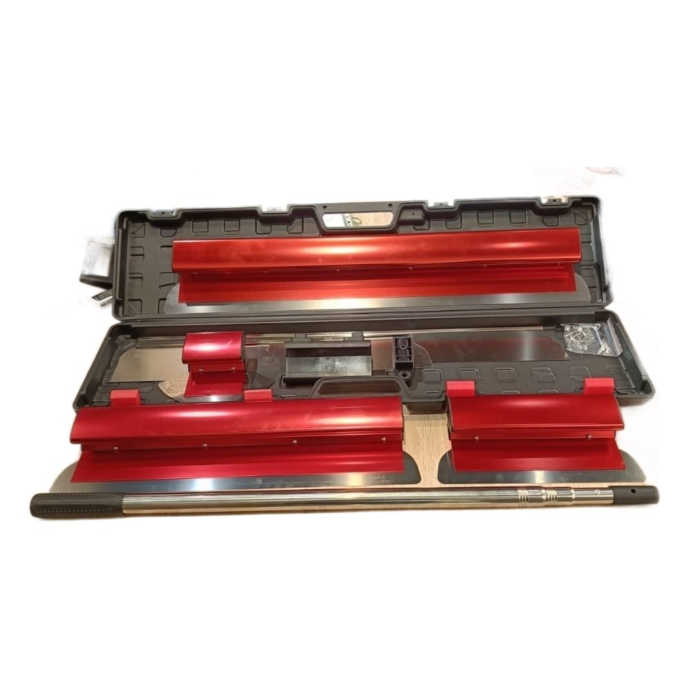 Профессиональный набор приглаживающих шпателей-правил. Лезвия выполнены из высоколегированной нержавеющей стали, рукояти из алюминия. Набор поставляется в удобном пластиковом кейсе, что облегчает хранение и транспортировку. Состоит из 4-х шпателей, 3-х запасных лезвий, телескопического удлинителя и адаптера. Шпателя: 300, 560 и 800мм с лезвиями толщиной 0.35 мм с закругленными краями. Лезвия: 300, 560 и 800мм толщиной 0.5 мм с острыми краями. Полукруглый шпатель для забора материала из ведра. Телескопический удлинитель 90-210см. Адаптер с фиксаторами для соединения шпателя с удлинителем и регулировки угла наклона.