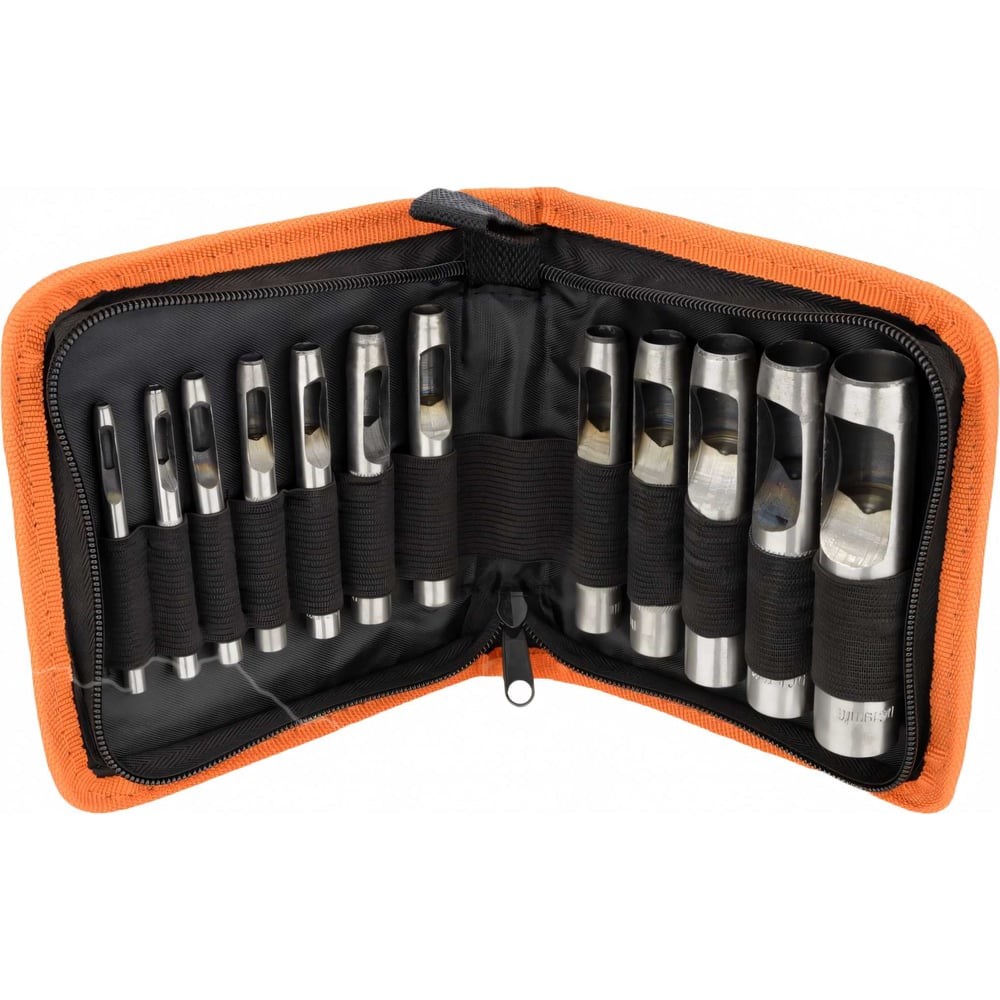 Набор просечек в сумке Автоdело 3-19 мм 12 шт. 40412 12068 предназначен для профессионального и частного применения. С помощью инструмента можно вырубить отверстия круглой формы в различных материалах. Ключевые особенности: оптимален для работы с кожей, деревом, паронитом, изделиями из ткани и пластика; произведен из высокопрочной инструментальной стали, устойчивой к износу и коррозии; приспособления остро заточены; режущие кромки термически обработаны посредством индукционной закалки для повышения эксплуатационных свойств; комплект содержит 12 насечек разного размера. Для компактного хранения и удобной переноски есть прочная сумка с индивидуальными ячейками.