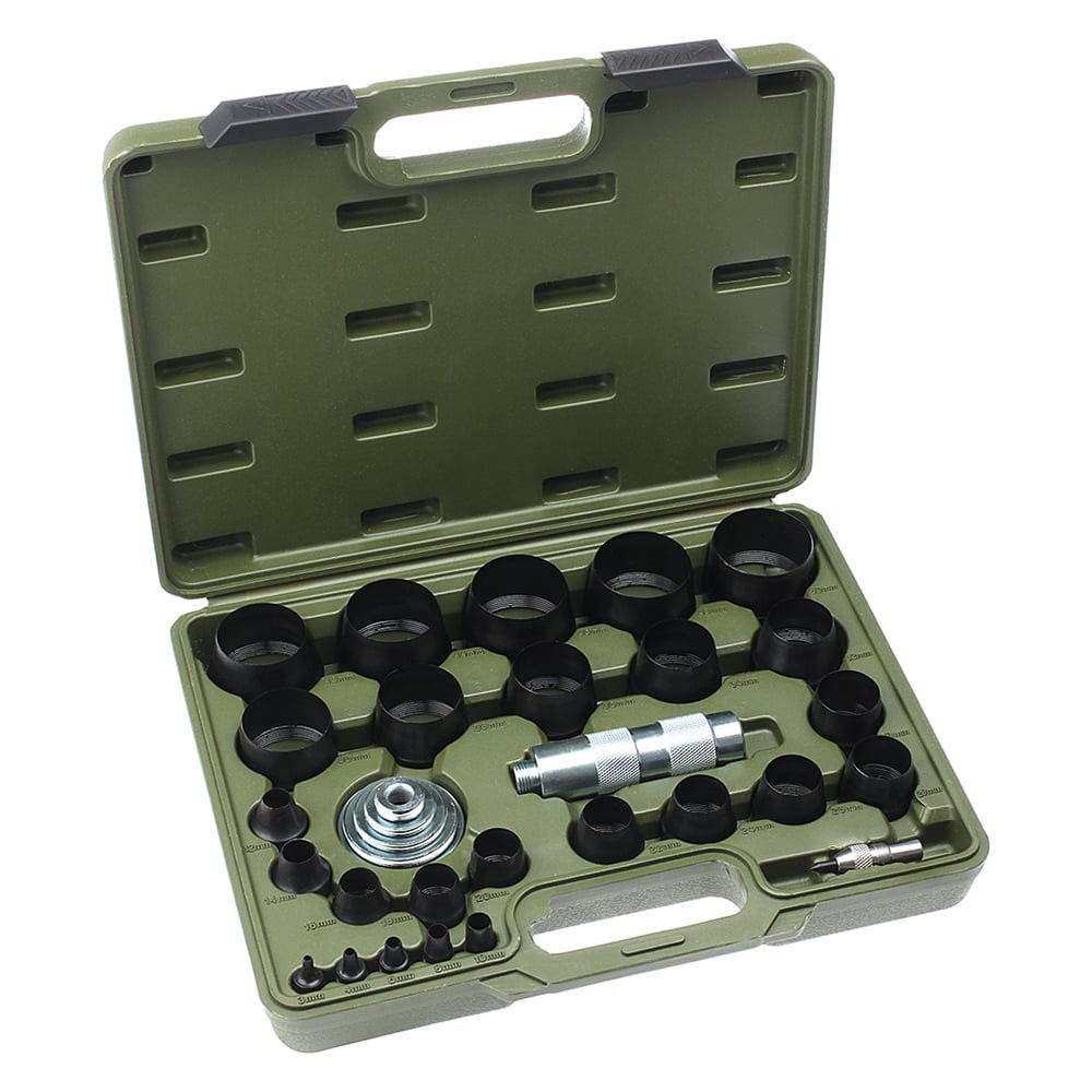 Набор просечек со сменными насадками Дело Техники 28 предметов в кейсе 376528 позволяет пробить отверстия в коже и других аналогичных материалах. Сменная насадка монтируется при помощи резьбового соединения.