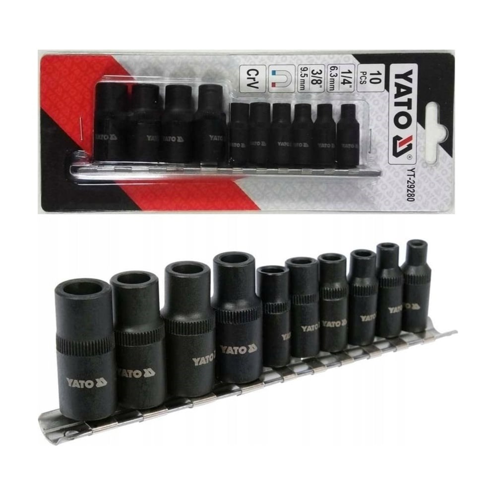 Набор адаптеров для метчиков 1/4" 3/8".комплект из 10 адаптеров на стальной направляющей YatoМожет использоваться с трещоткой или ручкойВнутри адаптеров магнит, удерживающий кран