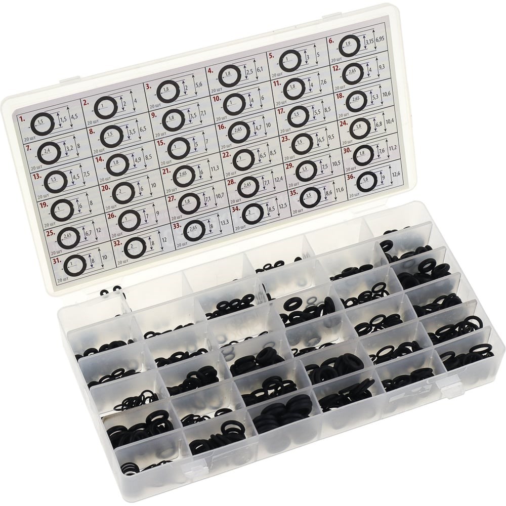 Набор из 720 штук резиновых колец. 36 размеров с внутренним диаметром от 1,5 до 9мм. Сантехник № 40. Материал колец: акрилонитрил-бутадиеновый каучук NBR. Соответствует группе резин 3 по ГОСТ 18829-2017, содержание акрилонитрильных групп 20%, соответствует марке СКН18, твердость 70 по ШОРу А. Применяется для замены изношенных колец в статических соединениях пневматических, гидравлических, топливных и смазочных систем с рабочей температурой от -40 до +100 град С. Хорошая устойчивость к растительным, силиконовым, нефтяным маслам и топливу, этиленгликолю, слабым водным растворам кислот, щелочей и солей. Типичным примером применения может служить: в пневматике: уплотнение соединений соленоидов, регулировочных винтов, быстросъемных фитингов, уплотнений стяжных винтов и примыканий при сборке отдельных узлов пневматических систем. в топливных системах мелкой бытовой и садовой техники (карбюраторы) в сантехнике: штоки кран-букс и переключателей, штуцеры подводок и фитингов. ВНИМАНИЕ Не использовать в тормозных системах, материал не устойчив к тормозным жидкостям!