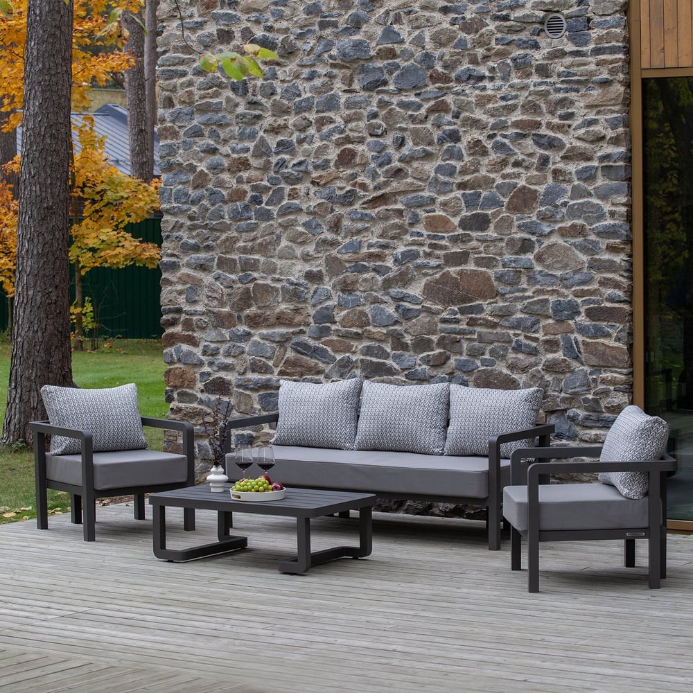 Набор садовой мебели AMALFI состоит из 4-х предметов: дивана, 2-х кресел и журнального столика, подойдет для размещения 5 персон. Уличный комплект создает комфортную зону для отдыха и приема гостей в загородном доме, клубе, отеле и ресторане. Прочная цельносварная конструкция и регулируемые ножки обеспечивают устойчивость мебели на любой поверхности. Прочный каркас мебели изготовлен из алюминия с матовым полимерным покрытием оттенка Lava. Диван и кресло дополняют большая подушка для сидения и мягкие подушки под спину в съемных чехлах из водонепроницаемой ткани, 100% олефин. Габариты дивана 190x65х76 см, максимальная нагрузка 180 кг. Габариты кресла 74х65x76 см, максимальная нагрузка 150 кг. Высота от пола до сидения (металла) 32 см. Габариты журнального столика 112х66х37 см, максимальная нагрузка 70 кг. Мебель доставляем в собранном виде в надежной упаковке.