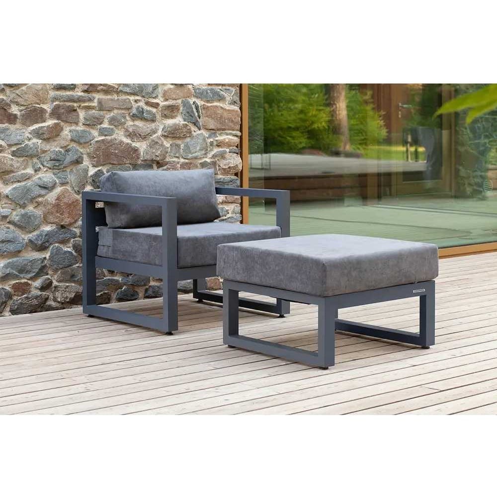 В наборе садовой мебели CAPRI представлены кресло и пуф. Каркас мебели выполнен из высокопрочного алюминия, на сиденьях предусмотрены удобные подушки темно-серого оттенка. Стильный уличный комплект подойдет для размещения двух человек. Алюминиевая мебель отличается долгим сроком службы, подходит для сада и террасы. Комплект мебели органично впишется в интерьер загородного дома, клуба, ресторана, отеля. Набор доставляется в собранном виде в надежной упаковке.