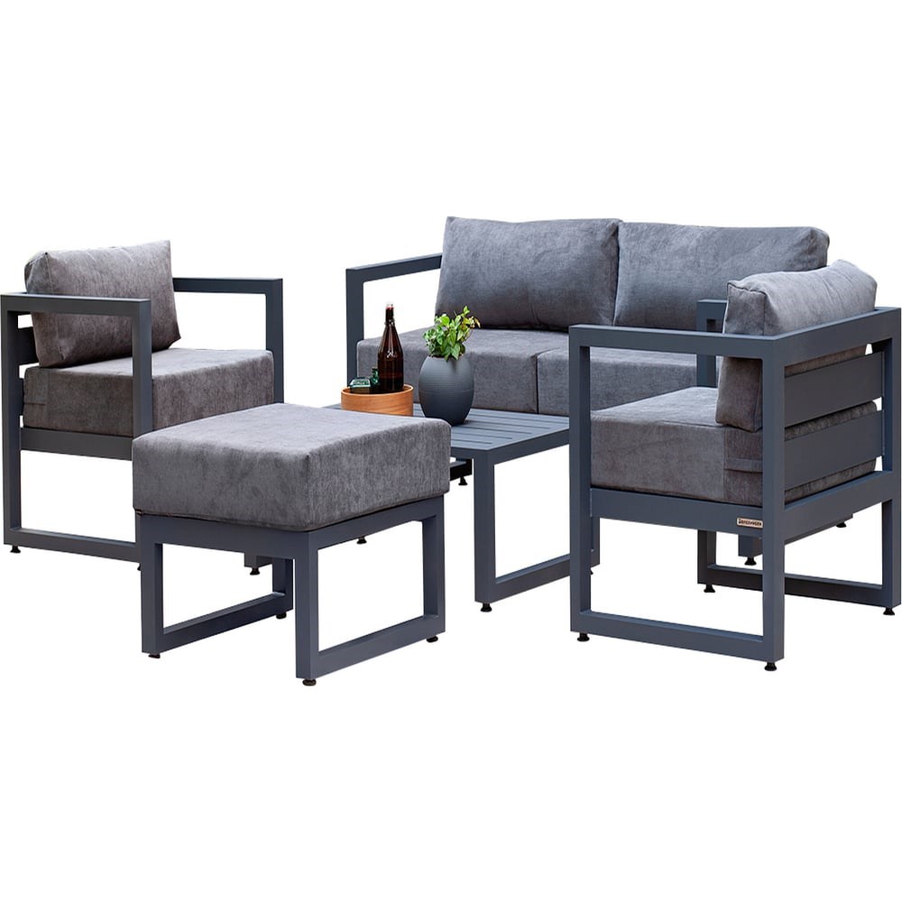 В большом наборе садовой мебели CAPRI представлены диван, 2 кресла, пуф и журнальный столик. Каркас мебели выполнен из высокопрочного алюминия, на сиденьях предусмотрены удобные подушки темно-серого оттенка. Уличный комплект создает комфортную зону для отдыха в саду, на террасе, у бассейна, подойдет для размещения шести человек. Алюминиевая мебель органично впишется в интерьер загородного дома, клуба, ресторана, отеля. Набор доставляется в собранном виде в надежной упаковке.