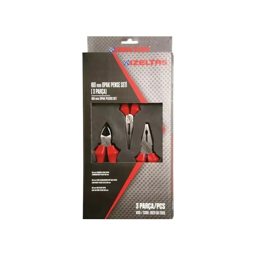 Набор шарнирных инструментов IZELTAS в картонной коробке - три профессиональных инструмента: Плоскогубцы комбинированные серии OPAK, длина 160 мм, код 3020122160 Узкогубцы прямые серии OPAK, длина 160 мм, код 3220132160 Бокорез серии OPAK, длина 160 мм, код 3700162160