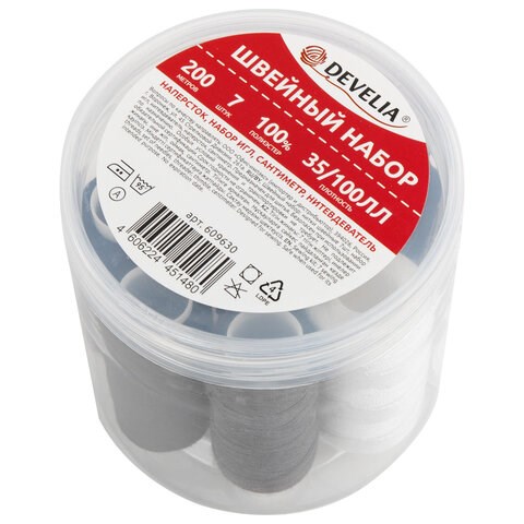 В набор входит 7 катушек армированных ниток в намотке 200 м стандартных цветов (толщина нити 100 ЛЛ - 2 штуки; 35 ЛЛ - 5 штук), иглы для ручного шитья разных размеров - 15 штук, сантиметр, наперсток, нитевдеватель. Поставляются в пластиковом прозрачном боксе с удобной завинчивающейся крышкой. Материал состоит из прочной армированной нити.