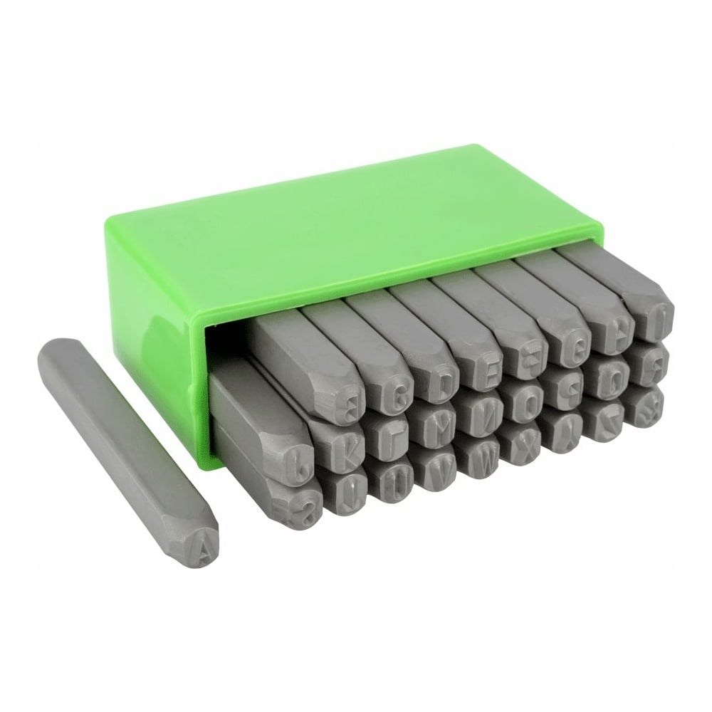 Набор стальных буквенных клейм BERIL 553004 латиница, 4 мм 12810 предназначен для нанесения цифровой маркировки на пластичные материалы. Клейма изготовлены методом фрезерования из хромованадиевой инструментальной стали и закалены до твёрдости 58-62 HRC, благодаря чему отличаются высокой прочностью и надежностью. Изделия защищены от коррозии методом фосфатирования. Набор состоит из двадцати семи клейм с буквами латинского алфавита. Изделия поставляются в пластиковом футляре для удобства хранения.
