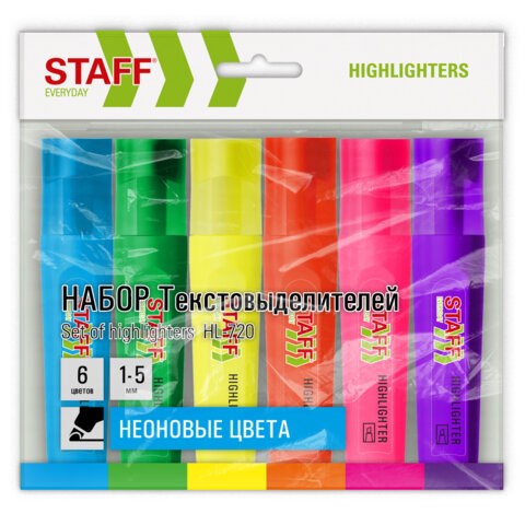 Набор текстовыделителей 6 НЕОНОВЫХ ЦВЕТОВ, STAFF "EVERYDAY HL-720", линия 1-5 мм, скошенный наконечник, 152556
