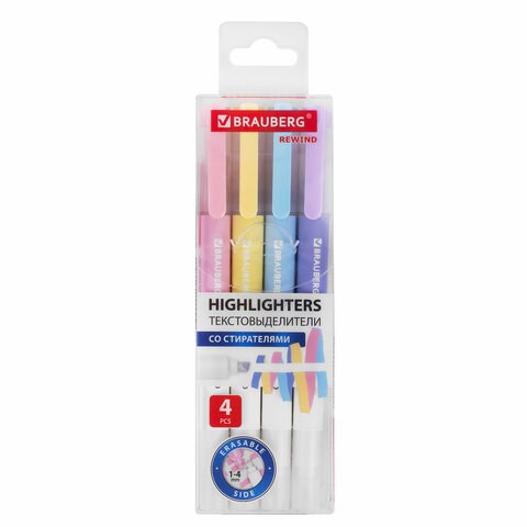 Набор текстовыделителей СТИРАЕМЫХ 4 ЦВЕТА, BRAUBERG "REWIND", двусторонние со стирателем, линия письма 1-4 мм, 152510