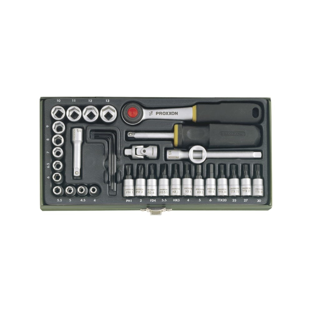 Набор точного инструмента механика на 1/4". 36 позиций. 36 предметов набора охватывают диапазон размеров насадок от 4 до 13 мм. Набор отверточных бит различной конфигурации. Пять шестигранных ключей от 1,25 до 3 мм.