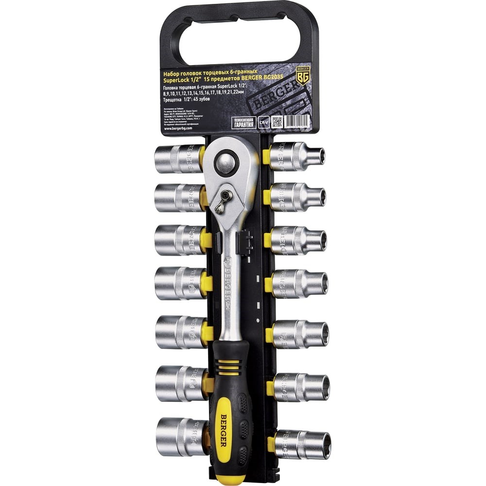 Набор торцевых 6-гранных головок SuperLock с трещоткой 1/2, 15шт Berger BG BG2035 - комплект ручных приспособлений для работы с резьбовыми соединениями при ремонте, сборке и демонтаже конструкций, различных узлов и агрегатов и мн. др. Трещотка существенно облегчает работу мастера, так как не требуется ее постоянное перекидывание на крепеже. Ручка ключа выполнена из двухкомпонентного материала и не проскальзывает в ладони.