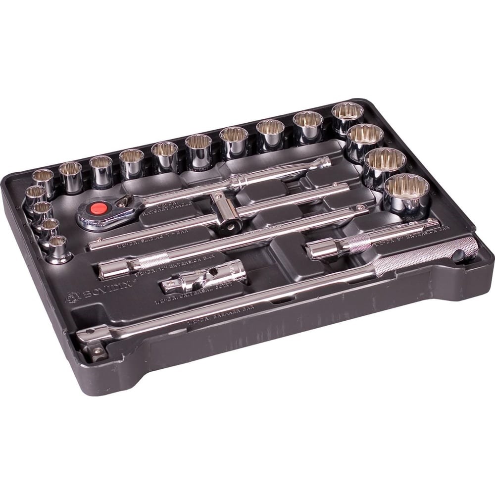 Набор торцевых головок и аксессуаров, 23шт, без кейса BOVIDIX 380102403/0 - комплект высокопрочных приспособлений для работы с болтовыми соединениями. В наборе представлен широкий ассортимент торцевых головок и вспомогательных аксессуаров. Для удобства размещения инструментов на рабочем участке предусмотрен ложемент с отдельными ячейками под каждый компонент.