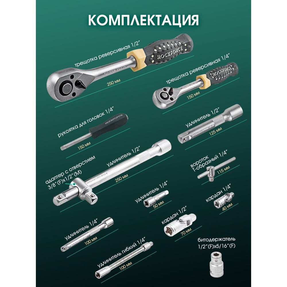 Набор торцевых головок и принадлежностей от бренда Rockforce — это идеальный инструмент для монтажа и демонтажа различного крепежа, который станет незаменимым помощником как для профессионалов, так и для домашних мастеров.Широкая комплектация. В набор входят ударные головки для работы с пневматическим инструментом, а также разнообразные размеры бит и торцевых насадок. Это делает его универсальным для выполнения самых разных задач.Высококачественные материалы. Изготовлен из прочной хромованадиевой стали, что обеспечивает долговечность и устойчивость к износу, позволяя использовать набор в условиях повышенных нагрузок.Удобство использования. Эргономичный дизайн инструментов снижает утомляемость и повышает эффективность работы. Головки и насадки легко меняются, что ускоряет процесс.Компактное хранение. Поставляется в пластиковом кейсе с металлическими защелками, что обеспечивает надежную защиту и удобство хранения. Легкий и удобный для переноски, что делает его идеальным для использования как в мастерской, так и на выезде.Универсальность применения. Подходит для работы с различными типами крепежа, что делает его незаменимым инструментом для любого мастера.Долговечность и надежность. Инструменты Rockforce созданы для длительной эксплуатации, гарантируя надежность и эффективность в любых условиях.