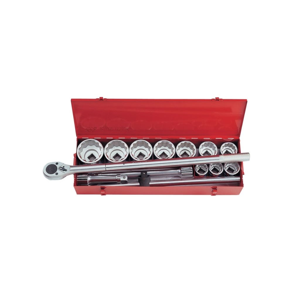 Набор торцевых головок с принадлежностями (1", двенадцатигранные, 36-80 мм, 14 предметов) KING TONY 8015MR включает в себя как оснастку, так и ручной инструмент. Комплект существенно облегчает монтаж крупного крепежа. Два замка препятствуют случайному открытию кейса при перевозке.