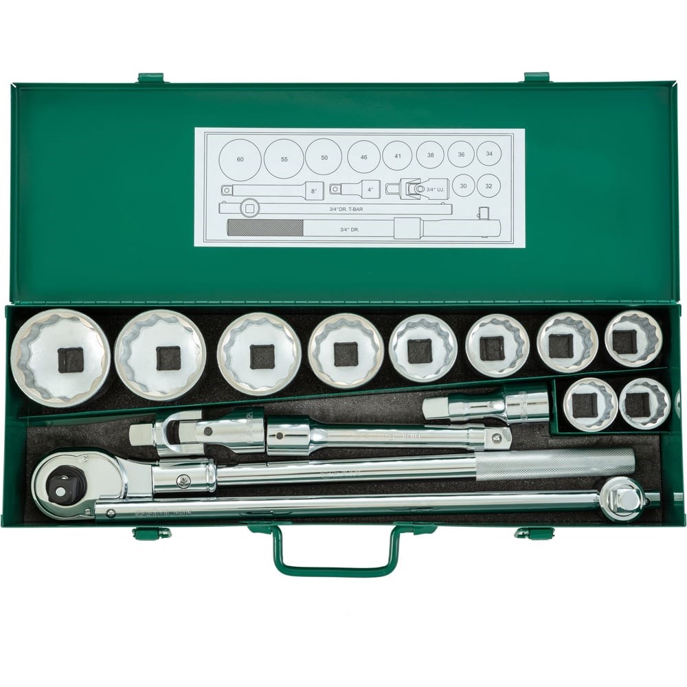 Набор торцевых головок с принадлежностями, 15 шт, 3/4 DR, Sata 09015 - идеальный вариант для работы в мастерских или сервисах при ремонте автомобильного транспорта. Комплект состоит из 15 предметов: торцевых головок распространенных размеров, трещоточной рукоятки, удлинителей и шарнира. Рабочие части приспособлений выполнены из прочной стали. Для удобства хранения и транспортировки предусмотрен удобный футляр. На данный товар действует условие безусловного возврата