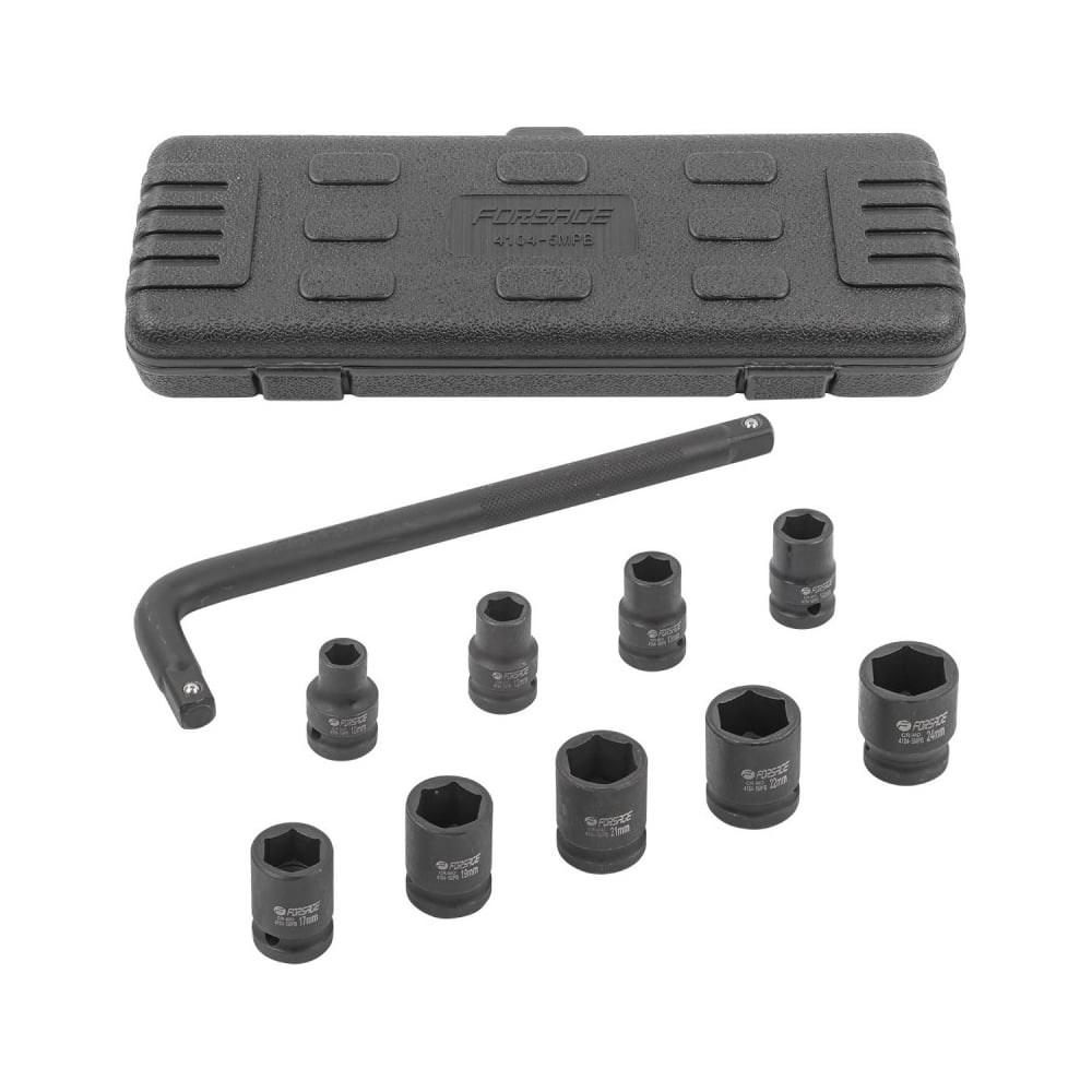 Набор ударных торцевых головок FORSAGE 1/2" из 10 предметов — это не просто инструмент, а надежный помощник в любой ремонтной задаче.Преимущества:Разнообразие размеров: Набор включает 9 торцевых головок различных размеров, которые идеально подходят для работы с различными крепежными элементами. Это универсальное решение для выполнения множества задач — от замены колес до ремонта двигателя.Прочная конструкция: Головки изготовлены из хроммолибденовой стали (CR-Mo), которая известна своей исключительной прочностью и устойчивостью к износу. Этот материал обеспечивает долгий срок службы инструмента даже при интенсивном использовании.Точность и надежность: Посадочный квадрат 1/2'' и 6-гранные профили головок обеспечивают плотную посадку на болтах и гайках, предотвращая их повреждения и минимизируя риск срыва граней.Удобство работы в труднодоступных местах: В комплект входит Г-образный вороток для головок, который позволяет легко справляться с крепежными элементами даже в самых труднодоступных местах. Его эргономичная рукоятка обеспечивает комфорт и контроль в процессе работы.Удобное хранение: Все инструменты аккуратно уложены в прочный пластиковый кейс, который обеспечивает защиту от повреждений и упрощает транспортировку. Теперь весь необходимый инструмент всегда под рукой.Регулярное обслуживание: После каждого использования рекомендуется очищать головки и вороток от загрязнений и смазывать, чтобы обеспечить их безупречную работу на долгие годы.Выбор правильного размера: Для предотвращения повреждений болтов и гаек всегда используйте головку соответствующего размера.