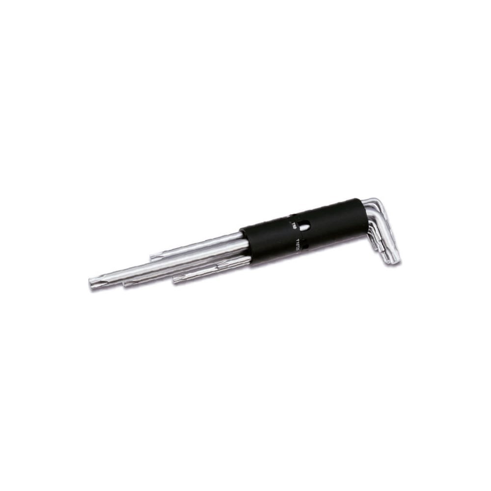 Набор из 8-и удлиненных угловых TORX-ключей HONITON 00-KW008301. Предназначены для закручивания или откручивания крепежей, имеющих тип профиля TORX размеров: T10, T15, T20, T25, T30, T40, T45, T50. Короткое плечо для приложения большего момента вращения, длинное для аккуратного завинчивания/отвинчивания. Изготовлены из высокопрочной хромованадиевой стали. Имеют хромированное покрытие, что надежно защищает от коррозии. Идеально подходят для работы в условиях ограниченного пространства.