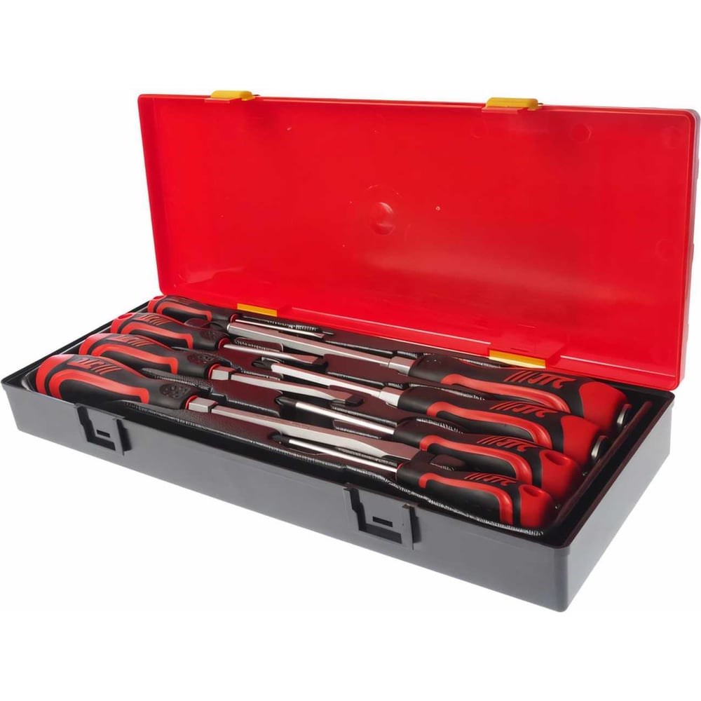 Набор усиленных отверток в ложементе, 8 предметов JTC K7085 пригодится для монтажных и демонтажных операций с резьбовыми соединениями, имеющими прямой и крестообразный шлиц. Инструменты обладают повышенной прочностью, легко выдерживают существенные нагрузки. Отвертки поставляются в кейсе, внутри которого располагаются на удобном ложементе.