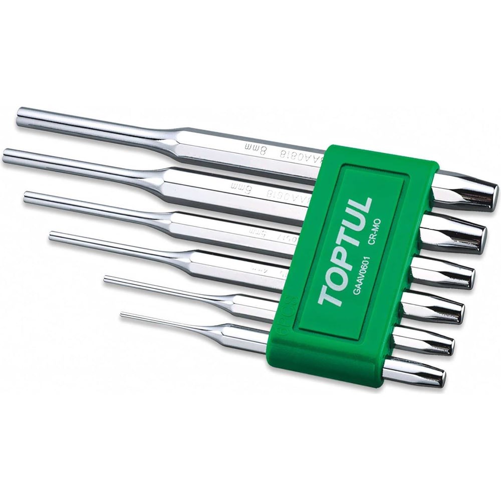 Набор выколоток TOPTUL 6 предметов GAAV0601 прост и удобен в использовании. Профессиональная термообработка для оптимальной прочности и долговечности Наконечники цилиндрических штифтов идеально подходят для извлечения полых разъемных штифтов Хромированное покрытие для максимальной защиты от коррозии