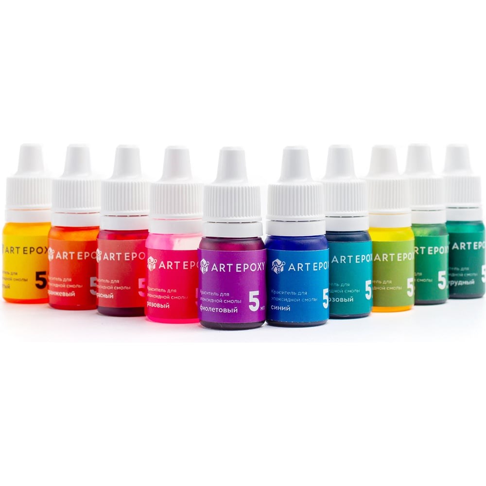 Набор жидких красителей ArtEpoxy 10 цветов по 5 мл 21612 используют для полного или частичного окрашивания эпоксидной смолы. Состав очень концентрирован. Красители отлично подходят для рисования картин, создания ювелирных украшений и художественного оформления мебели.