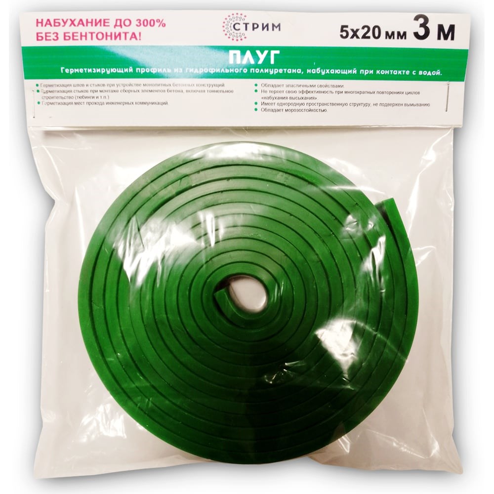 Набухающий полимерный профиль СТРИМ Плуг, 5x20 мм, 3 м ПЛГ00030520 - герметизирующий профиль на основе гидрофильного полиуретана. В присутствии воды набухает и надежно герметизирует швы и стыки в конструкциях. Не содержит бентонита! Область применения: Герметизация швов и стыков при устройстве монолитных бетонных конструкций. Герметизация стыков при монтаже сборных элементов бетона, включая тоннельное строительство (тюбинги и т.п.) Герметизация мест прохода инженерных коммуникаций. Дополнительные технические характеристики: Плотность - 1,3 г/см3 Температурный диапазон применения -15…+30 °С Набухание через 5 часов - 50% Набухание через 72 часа - 250% Гибкость на брусе R=25мм при -20°С - отсутствие трещин Прочность при разрыве - 0,4 МПа