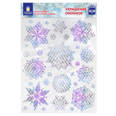 Изделие с изображением снежинок представляет собой наклейку размером 30x38 см, изготовленную из поливинилхлорида (ПВХ). Снежинки декорированы голографической пленкой, что создает интересный переливающийся эффект.