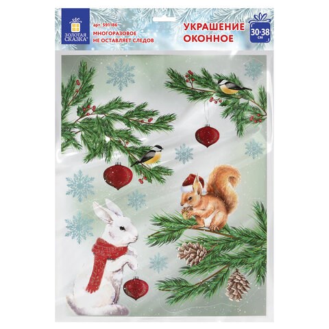 Наклейка для окон двусторонняя МНОГОРАЗОВАЯ 30х38 см "Зверята и ёлка", ЗОЛОТАЯ СКАЗКА, 591186
