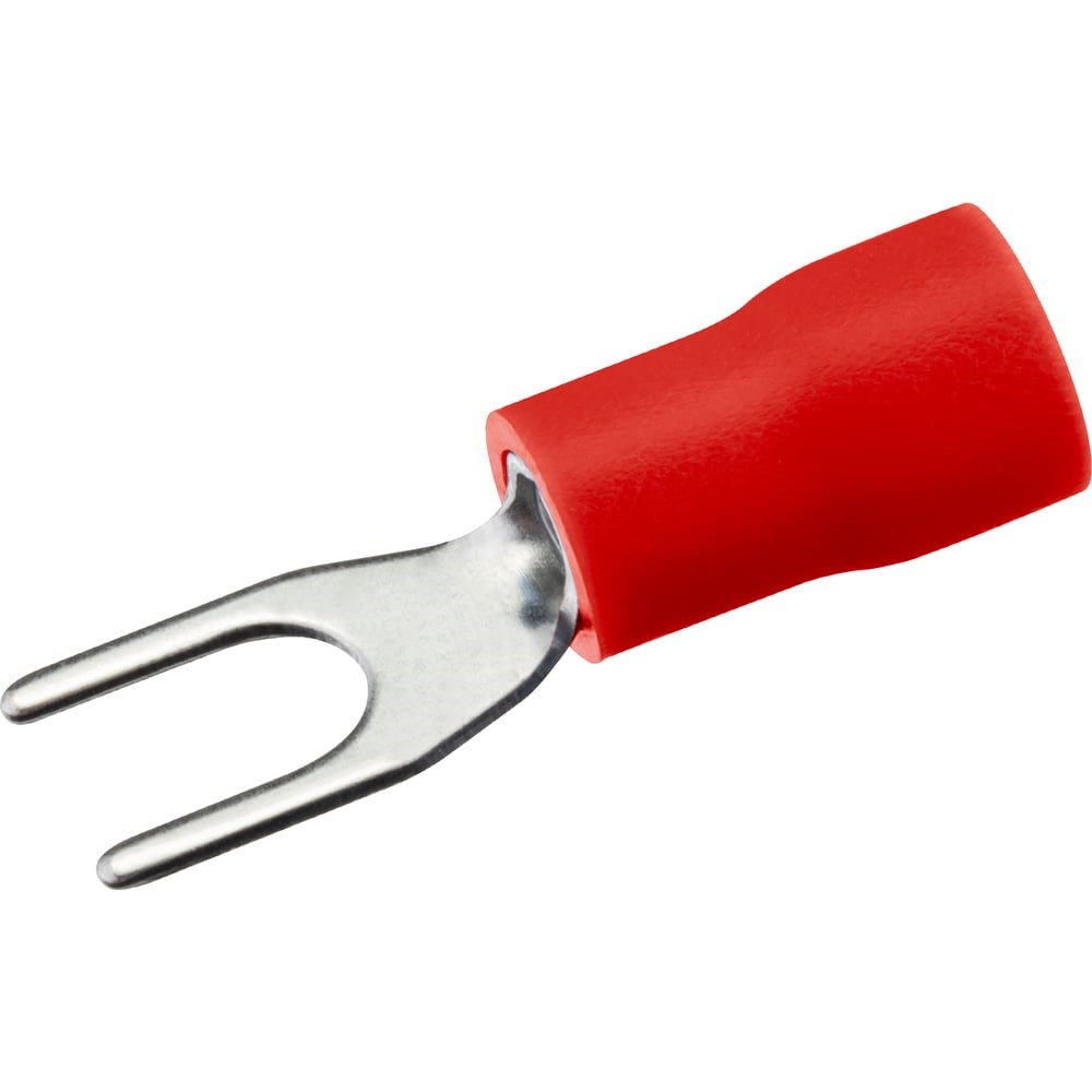 Вилочный изолированный наконечник НВИ 1,25-4 предназначен для оконцевания опрессовкой многопроволочных гибких медных проводов и быстроразъемных соединений. В наконечник вставляется медный провод сечением от 0,5 до 1,5мм2 до контактной пластины. Наконечник крепится с помощью (между) винтов или болтов, где происходит частое переключение контактов. Благодаря конструкции лопатки соединение/отсоединение происходит значительно быстрее, не требуя полного откручивания винта. Вилочный изолированный наконечник обладает следующими ПРЕИМУЩЕСТВАМИ: Эффективное оконцевание и защита многожильных проводов, цветовая маркировка, позволяющая идентифицировать размер наконечника, удобство монтажа проводов мелких сечений, а также быстрый, легкий и безопасный монтаж. Набор вилочных изолированных наконечников из 10 штук упакован в пакет с многоразовым замком, который легко открыть и закрыть. Это позволит сохранить порядок при ремонтных работах и при хранении вилочных изолированных наконечников.