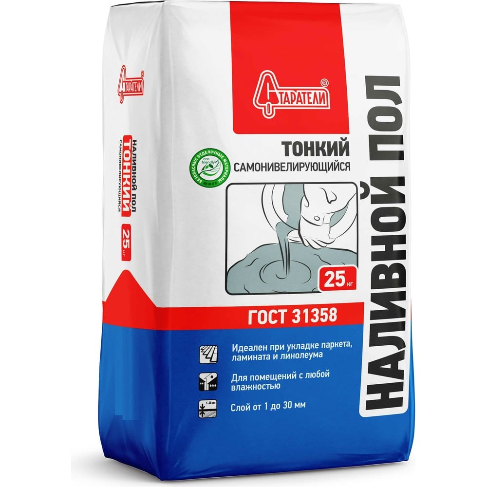 Наливной пол Старатели Тонкий самонивелирующийся 25 кг 3277/2581 применяется для финишного выравнивания оснований (бетонных, цементно-песчаных, гипсовых, ангидридных) под последующую укладку напольных покрытий. Используется в помещениях с нормальной и повышенной влажностью во всех типах зданий и сооружений А-В (жилые дома, детские учреждения, организации здравоохранения, санатории, спортивные сооружения, промышленные предприятия, административные здания и т.д.). Применяется для ручного и механизированного нанесения. Расход смеси при слое 10 мм: 14 - 15 кг/м² Жизнеспособность готового раствора, не менее: 40 минут Срок хранения в оригинальной неповрежденной упаковке: 6 месяцев с даты изготовления