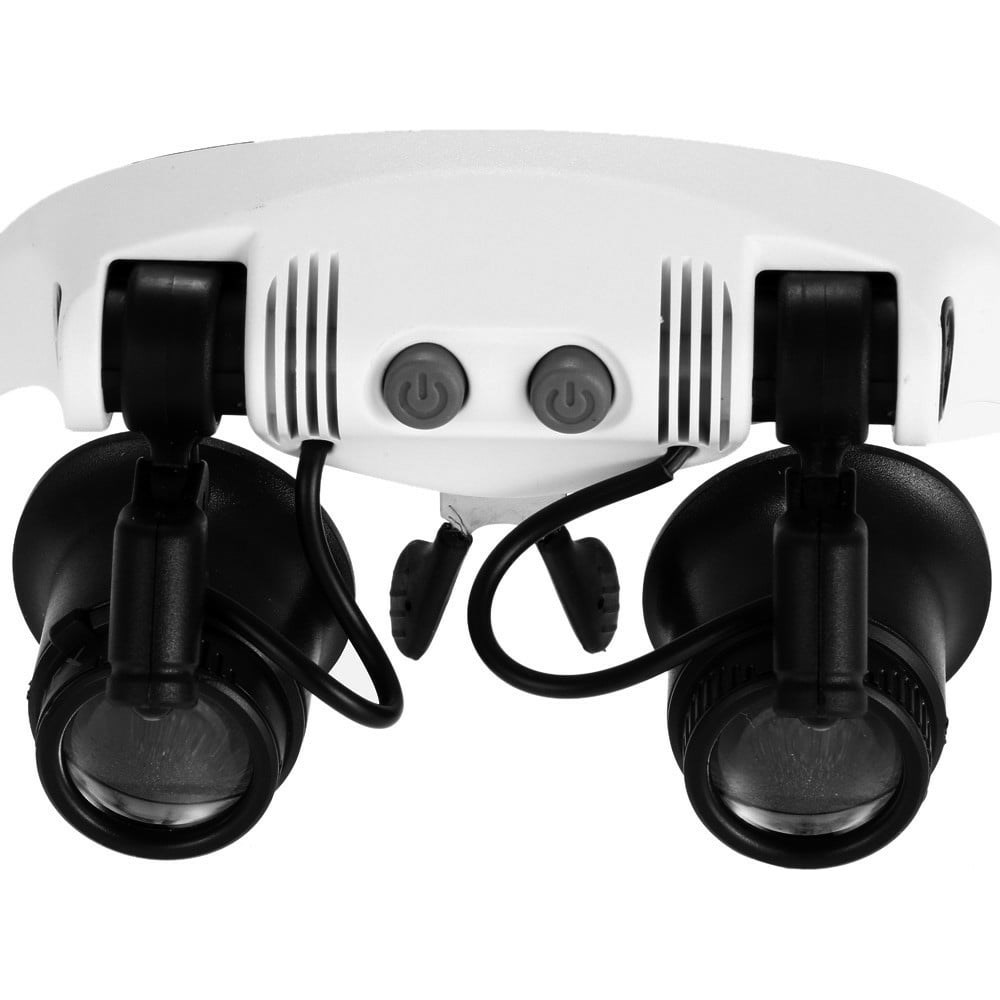 Лупа (налобная, 10/15/20/25x, очки с подсветкой, 2 LED) Pro Legend PL4402 используется во время работы с мелкими деталями. Подсветка состоит из двух ламп, которые можно включать отдельно друг от друга. Регулировка увеличения позволяет определить оптимальный режим работы. Параметры: Увеличение – 10x/15x/20x/25x; Питание – 3 батарейки LR03 (AAA) (мизинчиковые, в комплект не входят); Подсветка – 2 суперярких светодиода; Габариты – 150х110х70мм; Вес без батареек – 85 г; Материал – пластик.