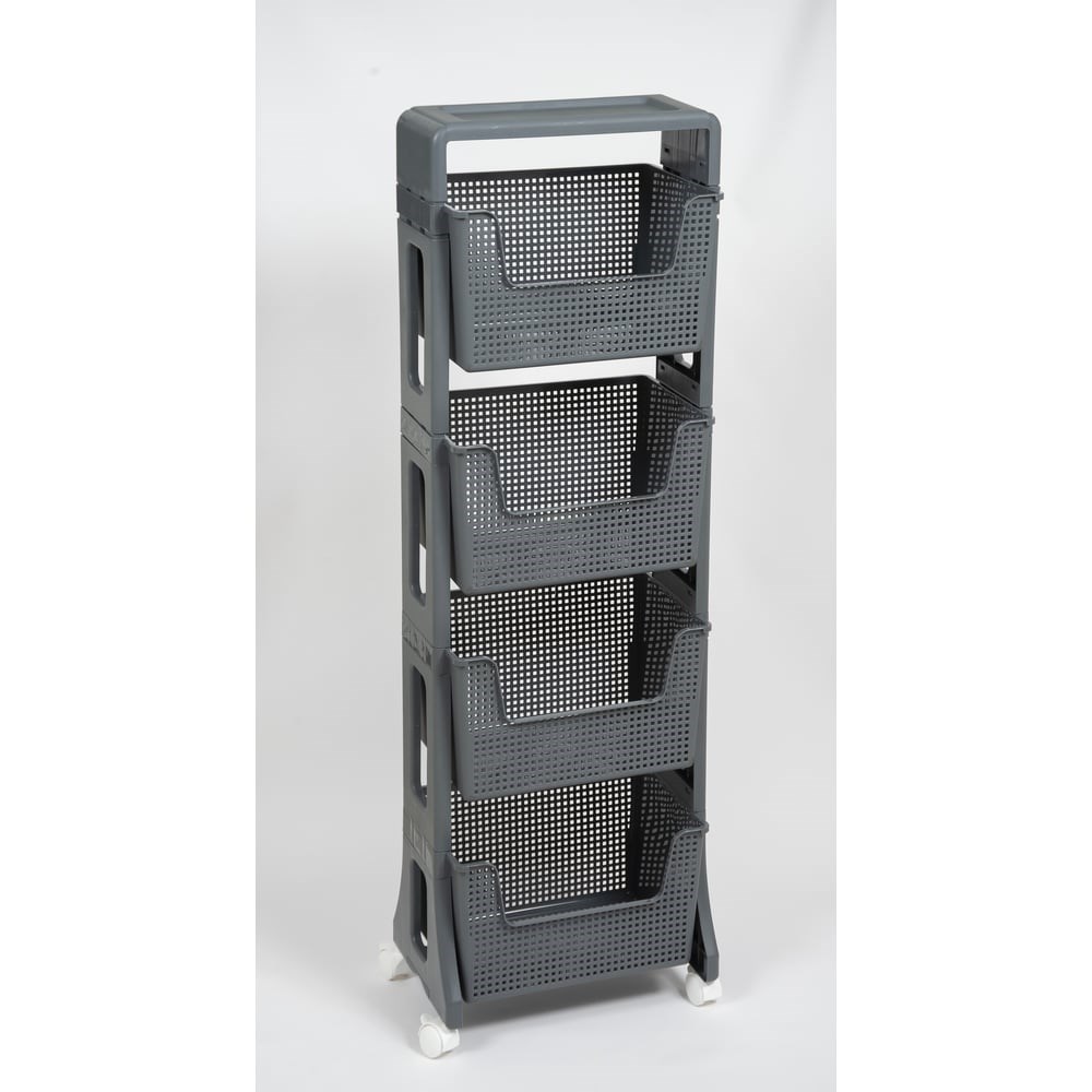 Этажерка Violet Лофт напольная, 4-х ярусная, на колесах, серая 770418 – универсальное решение для компактного хранения в доме, офисе или на даче. Выполнена из пластика, не содержащего бисфенол А. Абсолютно безопасна для здоровья, поэтому может использоваться в любом уголке Вашего дома. Преимущество этажерки в ее легкости, устойчивости к влаге и простоте в уходе. Удобная система хранения – полки вместят большой объем предметов. Сверху этажерки имеется дополнительная многофункциональная полка. Благодаря колесам стойку можно перемещать без особых усилий, а тормоза на колесиках надежно фиксируют положение этажерки. Органайзер для хранения подойдет для парикмахерской, салона красоты, массажного кабинета, медицинского центра. В прихожей или гардеробной можно использовать как этажерку для обуви или хранения разных вечно теряющихся вещей: шапок, шарфов, перчаток, зонтиков. Применение как органайзера в ванной комнате или туалете для хранения предметов гигиены, косметики, банных принадлежностей помогает сделать систему хранения удобной, простой и функциональной. Изделие поставляется в разобранном виде в индивидуальной коробке.