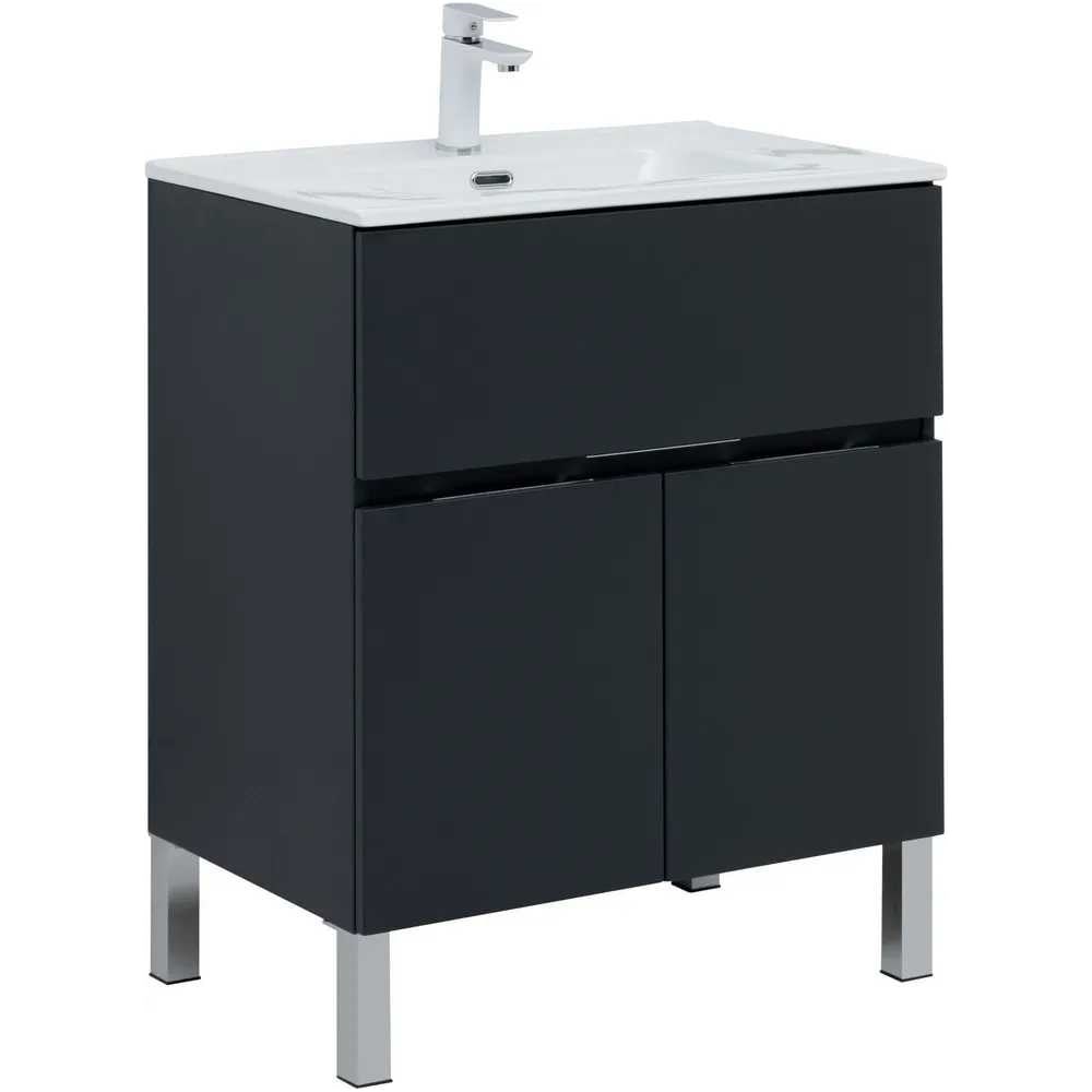 Тумба под раковину в ванную комнату Aquanet выполнена в стиле модерн и входит в коллекцию мебели Алвита New. Представленная коллекция мебели для ванных комнат осчастливила сотни покупателей, так как они приобрели сочетание дизайна, качества и функциональности. Важный момент при выборе тумбы для умывальника - это материалы. Они должны быть адаптированы к эксплуатации в условиях повышенной влажности. Влагостойкий ЛДСП - материал, из которого выполнен корпус и фасад изделия, соответствует этим характеристикам. Тумба в цвете антрацит освежит ванну и будет отлично сочетаться с сантехникой. Тумба в ванную также обеспечит экономию места, так как в ней предусмотрены вместительный ящик, оснащенный механизмом доводчика.