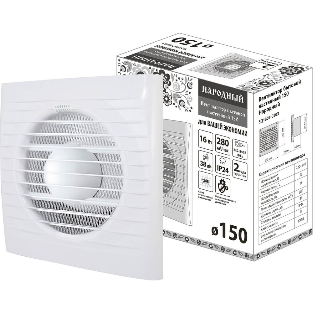 Вентилятор бытовой настенный 150 Народный – необходимое устройство для обеспечения качественной вентиляции в вашем доме. В наборе к вентилятору присутствует защитная сеткой от насекомых (антимоскитная сетка). Устанавливается бытовой вентилятор в ванную, туалет, кухню, совмещенного санузла и другие помещения для вытяжки, способствует устранению избыточной влажности и нейтрализации неприятных запахов. Вентиляционный вентилятор устанавливается непосредственно в проем вентиляционной шахты. Крепление осуществляется при помощи шурупов, которые идут в комплекте. Вентилятор для вытяжной вентиляции идеально подходит для монтажа с воздуховодами диаметром 150 мм, а также для квадратных отверстий соответствующих размеров. Преимуществом модели является низкий уровня шума в 38ДБ в совокупности с классом защиты устройства IP24, который позволяет сохранять комфортное состояние человеку, даже при работе вытяжки в ванной, туалете или иного помещения с повышенной влажностью, и высокая производительность 280 м3/ч. Вентилятор в ванную вытяжной электрический имеет встроенную защиту двигателя от перегрева, наличие индикатора сети на передней панели. Питание строительного устройства осуществляется от сети переменного тока с напряжением 230В через кабель или шнур. Корпус вентилятора, выполнен из прочного и качественного пластика. Модель, без сомнения, подчеркнёт интерьер любого помещения, выполняя полезные функции по очистке воздуха и создания благоприятной атмосферы.