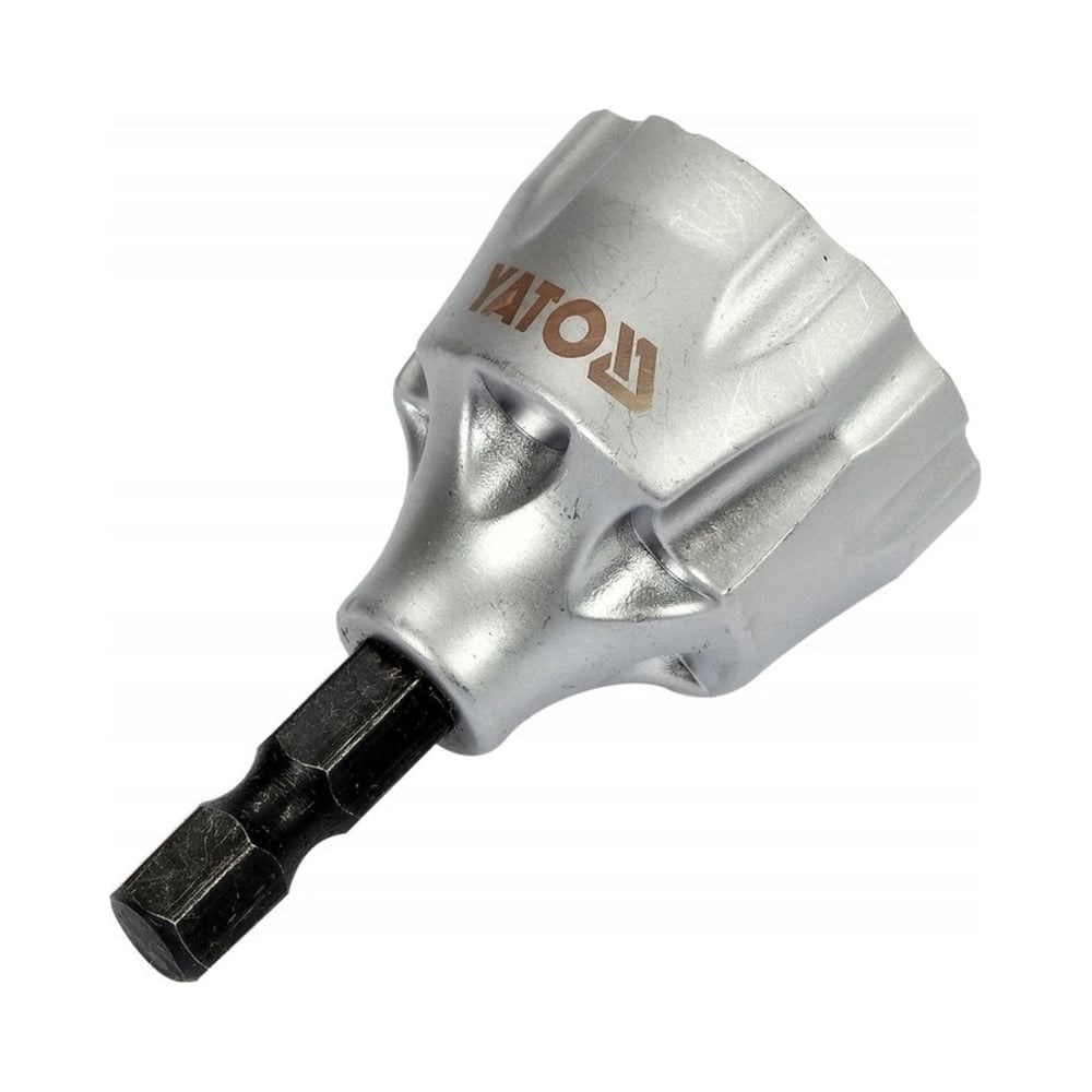Гратосниматель YATO наружный 3-19мм YT-22357 предназначен для скругления металлических, деревянных и др. элементов. Корпус представляет собой металлическую, коническую воронку с шестигранной оправкой /водилкой/ для установки в дрель. Общая высота 49 мм, внутренний диаметр внизу 19 мм и вверху 3 мм - это рабочий диапазон. Глубина около 12 мм. В корпусе имеются три стальных режущих лезвия/режущих вставки/ шириной около 1,5 мм, изготовленных из карбида YG8. Материал пластин позволяет эффективно скруглять стержни из нержавеющей стали, закаленной стали, меди, латуни, алюминия, стекловолокна, дерева и пластика. Важным применением является сглаживание концов резьбы на болтах или стержнях. Скорость сверла следует регулировать в зависимости от обрабатываемого материала.